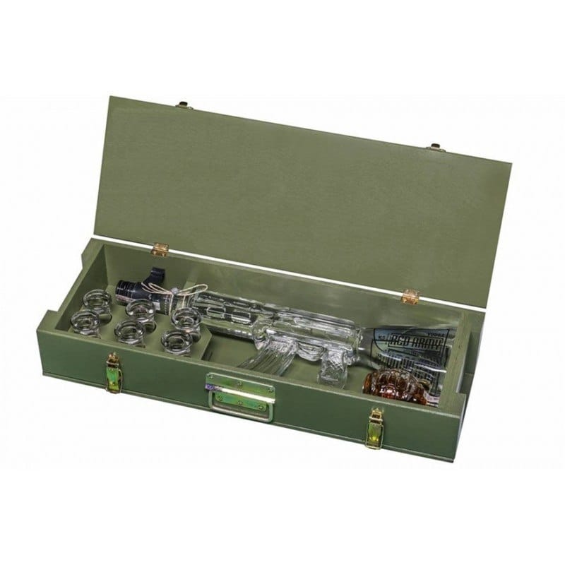 - A glass replica of the Russian Kalashnikov rifle, containing one liter of high-quality vodka, produced in Poland from crystal-clear water. - A glass replica of a grenade containing 200ml of herbal liqueur. - Six shot glasses inscribed with "Red Army."