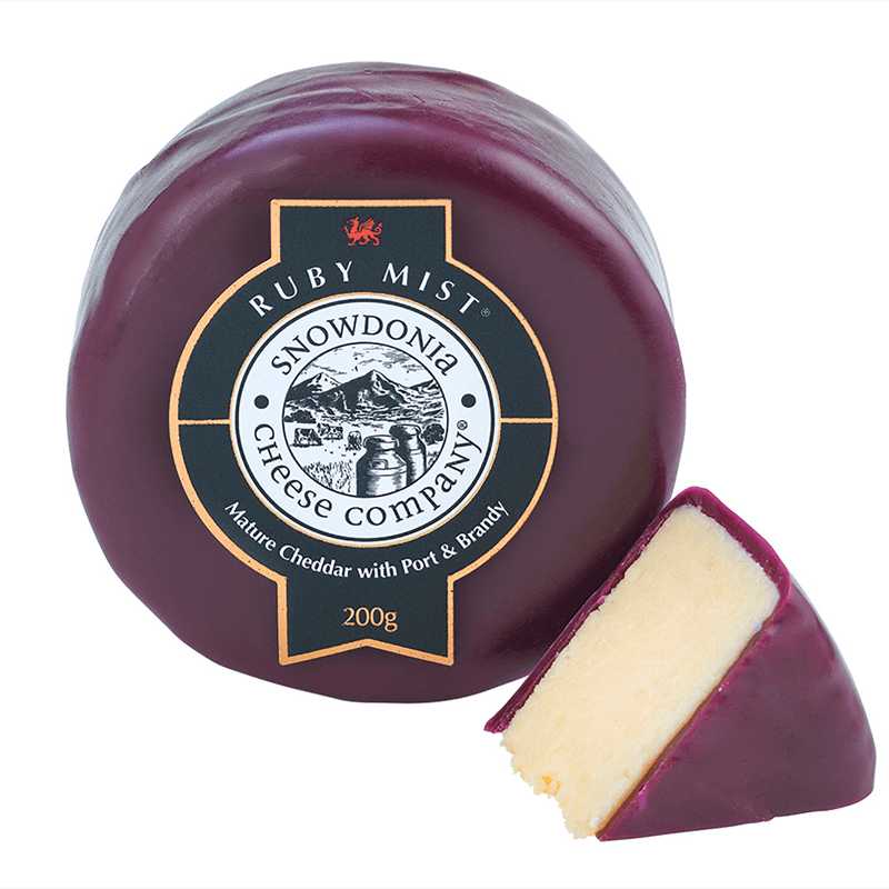 Ruby Mist Cheddar is an aged Cheddar cheese, encased in burgundy wax and flavored with notes of white Port and Brandy. It stands out for its delightful taste and silky texture, making it ideal for gourmet pairings.
