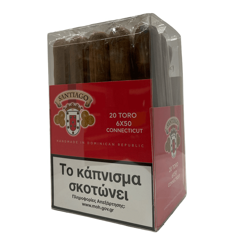 Santiago Connecticut Toro 20' παρασκευάζονται στον Άγιο Δομίνικο, με wrapper Connecticut και είναι εντελώς χειροποίητα.